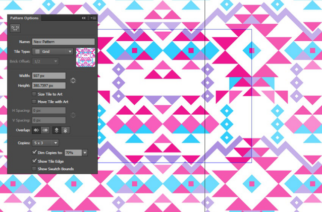 選擇您的設(shè)計(jì)組并打開(kāi)“圖案選項(xiàng)”以創(chuàng)建新圖案。確保您的設(shè)計(jì)樣本中沒(méi)有任何間隙。如果是,請(qǐng)通過(guò)更改“圖案選項(xiàng)”面板中邊界框的寬度或高度來(lái)調(diào)整圖案的邊界。