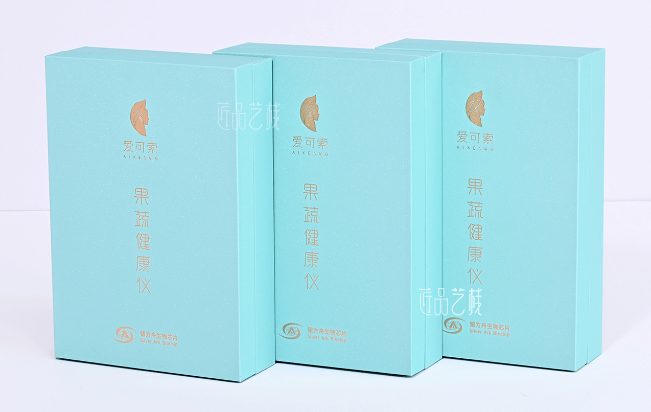 愛可索手持式家用果蔬農(nóng)殘檢測儀品牌,是銀方舟生物芯片自主創(chuàng)新的國內(nèi)首臺家用果蔬農(nóng)殘檢測儀。在該產(chǎn)品包裝盒定制中,佳潤隆包裝&匠品藝棧,采用簡約蒂夫藍為底色,并在印刷制作中搭配表面磨砂和浮雕燙金工藝,使其既不失生物科技的時尚感,同時又以更親潔、綠色的品質(zhì)體驗呈現(xiàn)于市場,受到客戶企業(yè)和銷售市場的一致高度好評。